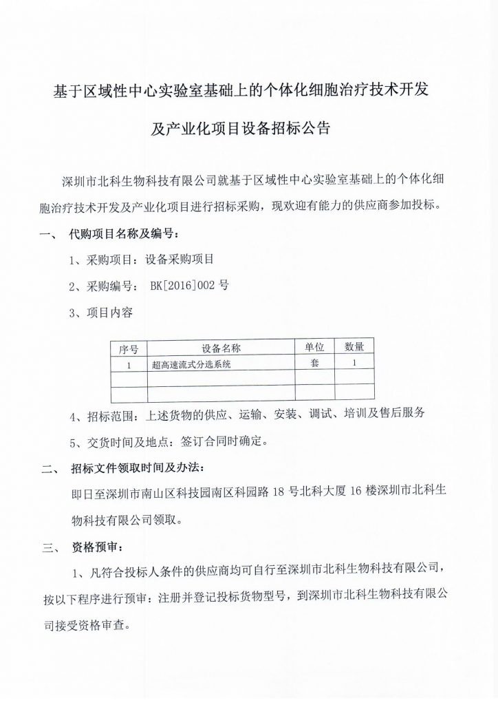 基于區(qū)域性中心實驗室基礎上的個體化細胞治療技術開發(fā)及產(chǎn)業(yè)化項目設備招標公告