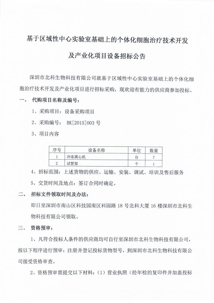 基于區(qū)域性中心實(shí)驗(yàn)室基礎(chǔ)上的個(gè)體化細(xì)胞治療技術(shù)開(kāi)發(fā)及產(chǎn)業(yè)化項(xiàng)目設(shè)備招標(biāo)公告