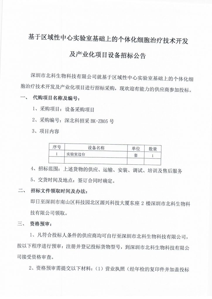 基于區(qū)域性中心實(shí)驗(yàn)室基礎(chǔ)上的個(gè)體化細(xì)胞治療技術(shù)開發(fā)及產(chǎn)業(yè)化項(xiàng)目設(shè)備招標(biāo)公告